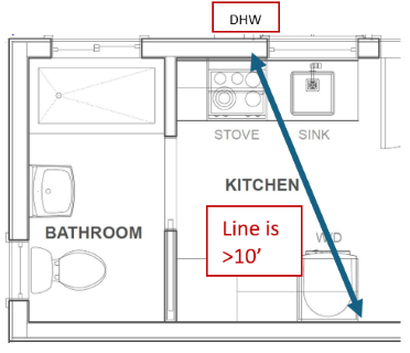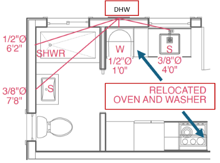 In the small ADU example, the sink and bathroom were close together, but the laundry machine was more than 10’ away. The design team shifted appliances and cupboards to cluster all hot-water fixtures and appliances.