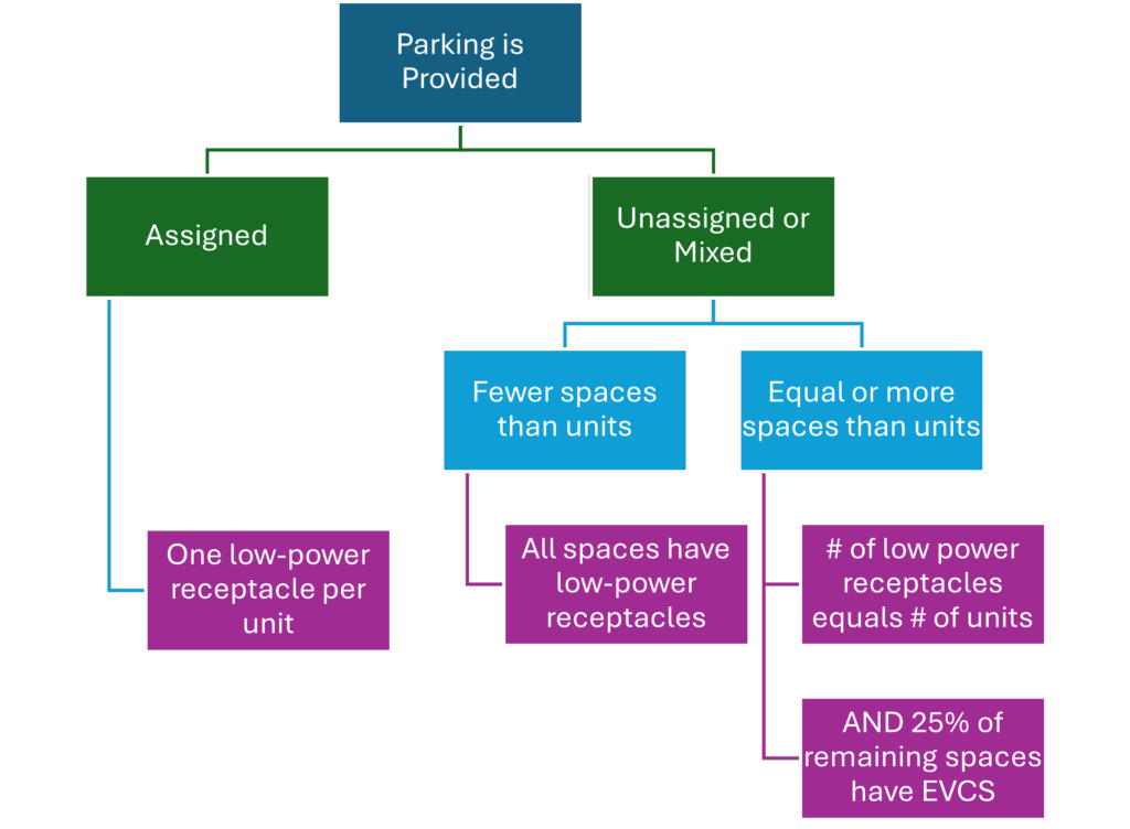 The number of spaces that must be equipped with receptacles depends on both the total number of parking spaces provided and whether those spaces are assigned to individual housing units or designated as unassigned, common parking. The general target is one Low Power Level 2 receptacle per housing unit. However, because many developments do not provide one parking space per unit, the code is structured to maximize EV-ready infrastructure within the available parking. Conversely, when a project includes a large amount of parking, any ‘extra’ spaces designated for common use must go beyond receptacles alone. In these cases, the code requires EV Charging Stations (EVCS), not just a receptacles, for 25% of common parking spaces.